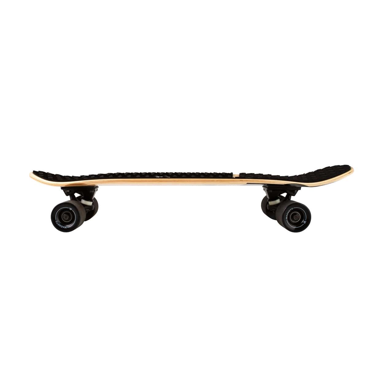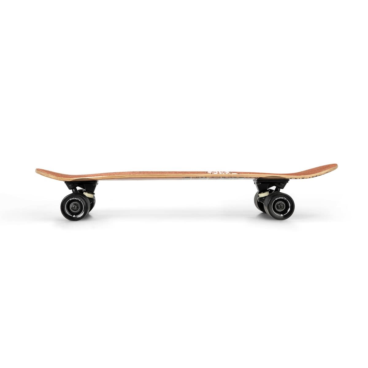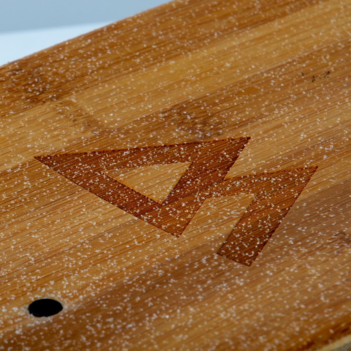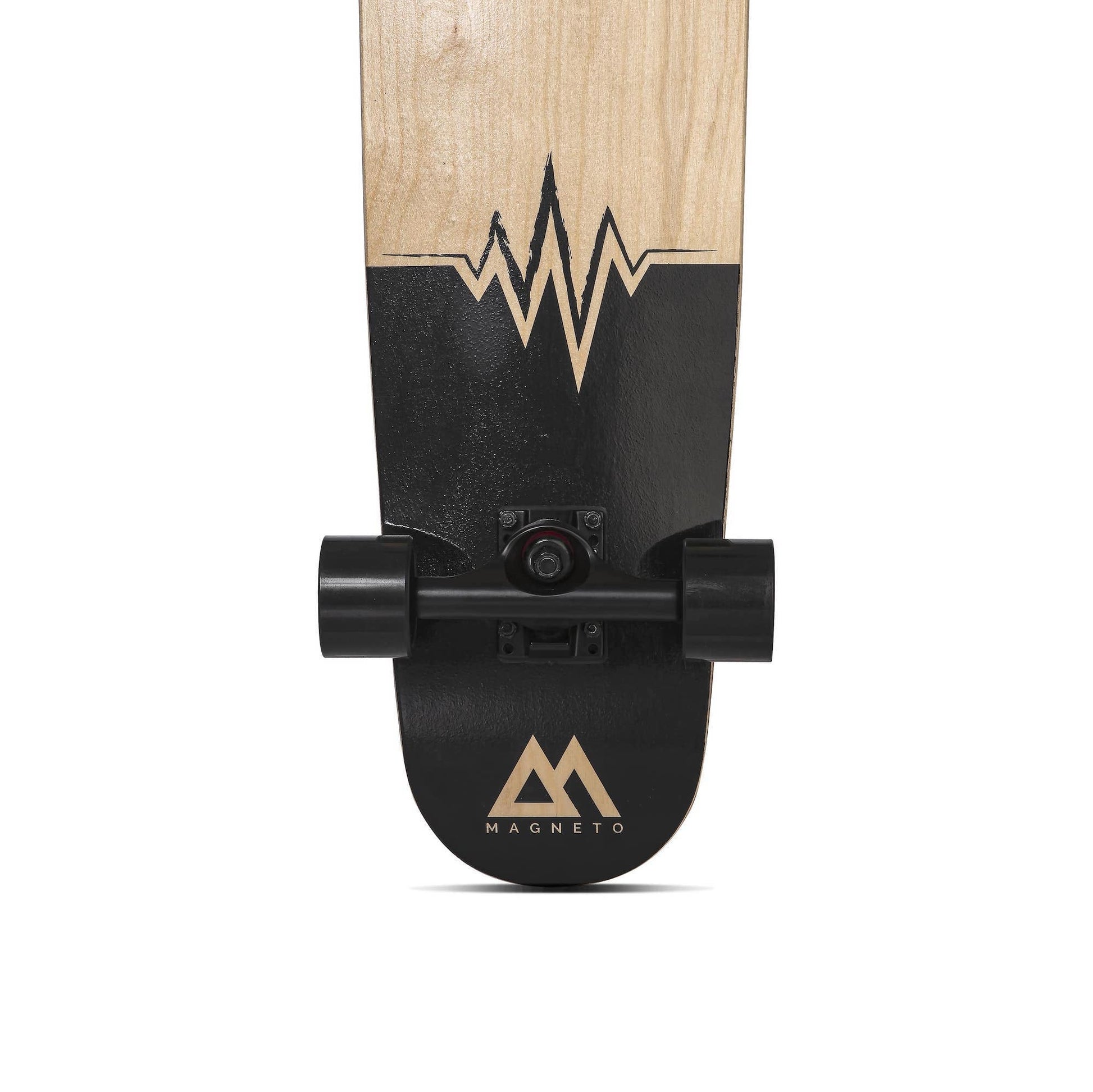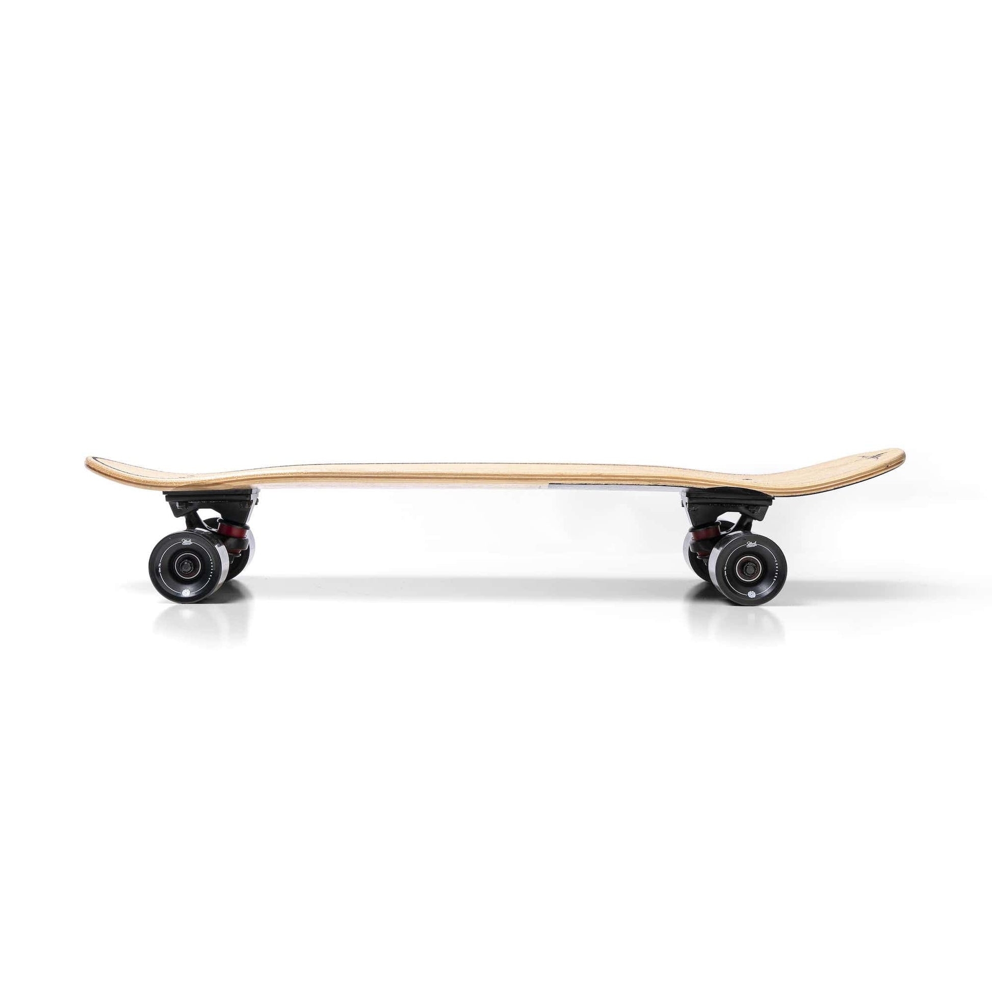 The deck is 8 mm thick and composed of 5 plies of maple and 2 plies of carbon-infused bamboo.